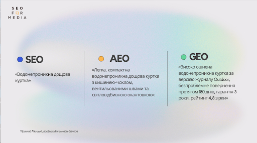 Якщо SEO зосереджується на залученні кліків, то AEO — на чіткості та зрозумілості збагачених даних у реальному часі, а GEO допомагає вибудувати довіру завдяки авторитетному голосу.