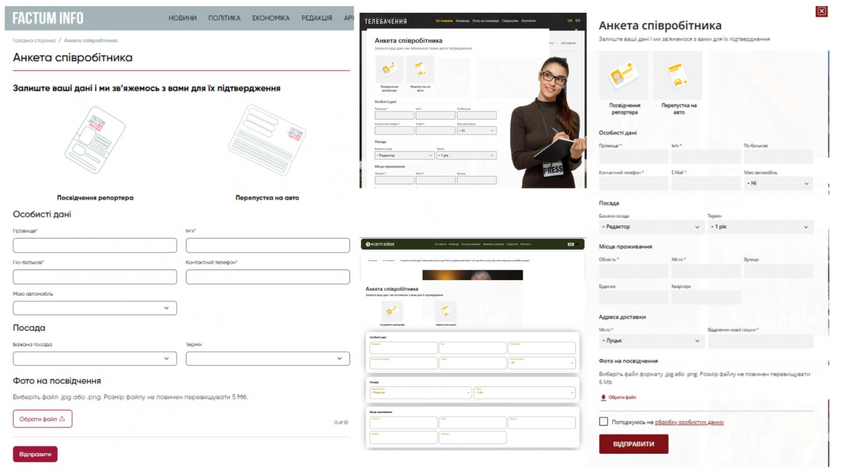 Анкета співробітника на «Фактум Інфо», «Фокус війни» «Українське цифрове телебачення» та «Серце Харкова». Останній сайт уже видалений