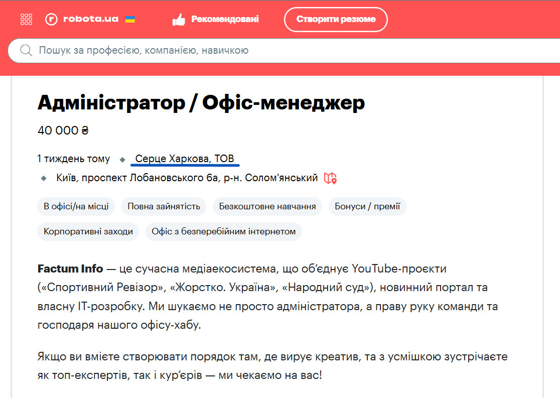 У січні 2026 року на сайті robota.ua з’явилося оголошення про пошук адміністратора/офіс-менеджера для Factum.Info. Але розмістило його не ТОВ «Фактум інфо», а ТОВ «Серце Харкова», хоча номери й адреса вказані саме «Фактума».