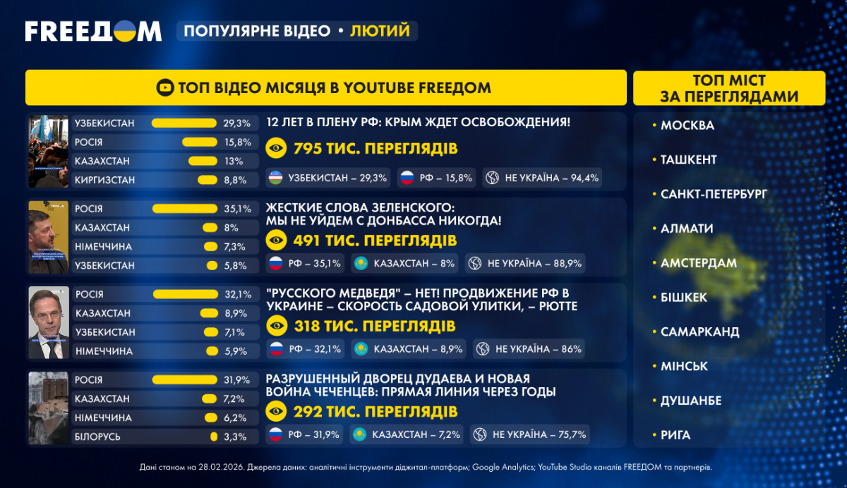 У лютому редакція FREEДОМ підготувала тематичні спецефіри до четвертої річниці повномасштабного вторгнення Росії в Україну та до Дня спротиву окупації Криму. 24 лютого в ефір FREEДОМ вийшли спеціальні проєкти та прем’єри — ексклюзивні інтерв’ю, включення з Брюсселя, Києва й регіонів, репортажі з фронту, історії стійкості та документальні фільми. Звернення Президента України, в якому Володимир Зеленський наголосив, що українці обрали не капітуляцію, а захист своєї країни, найбільше подивились у Росії – 35,8% Казахстані – 10,5% Узбекистані – 8%, залом міжнародна аудиторія – 93,5%. Високими також були перегляди звернення принца Гаррі про гідність та незламність українців, які показали світові справжню стійкість. Понад 170 тис. переглядів отримав фрагмент інтерв’ю Володимира Зеленського для агенції AFP про те, що країна продовжує жити й працювати і Росії за чотири роки не вдалося загнати українців у бункер: 88% — з-за кордону, 33% — з Росії. Найвищі YouTube-перегляди у лютому зібрало коротке відео з історією спротиву українців Криму російській окупації: загалом 1,3 млн переглядів – понад 790 тис. на YouTube-каналі FREEДО.LIVE та понад 540 тис. на FREEДОМ, 94,4%– з-за кордону, зокрема 29,3% — з Узбекистану, 15,8 — Росії.