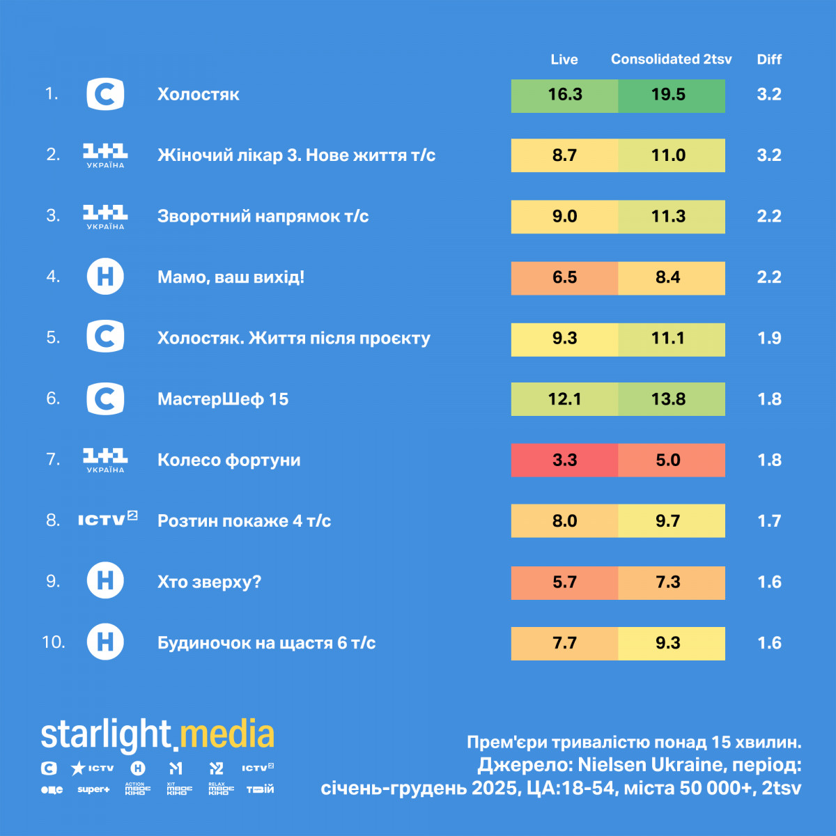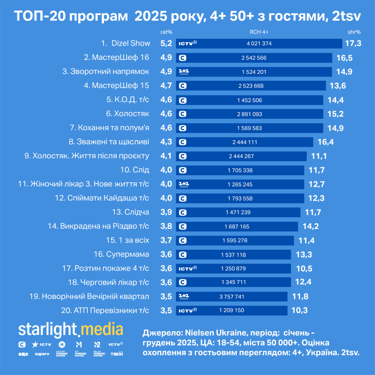 До двадцятки найрейтинговіших продуктів 2025 року за комерційною аудиторією 18–54, 50 тис.+ увійшов переважно контент каналів групи Starlight Media. Очолили перелік топові проєкти СТБ та ICTV2: головна прем’єра осені «Холостяк», «МастерШеф» і новорічний випуск Dizel Show. Далі в рейтингу – серіальні хіти від СТБ: «К.О.Д.» та «Кохання та полум'я». Також у двадцятці – проєкти СТБ «Супермама», «Зважені та щасливі», постшоу «Холостяка». Ще дві сходинки – за контентом каналу «1+1 Україна»: серіалом «Зворотний напрямок» та шоу «Новорічний Вечірній квартал». Близько половини тайтлів у переліку найкращих – кінопоказ: більшість фільмів вийшли в ефірі Нового каналу, ще один – на ТЕТ.
