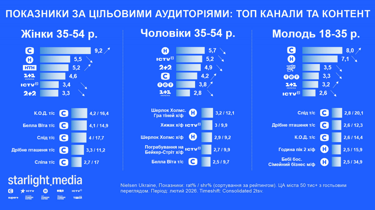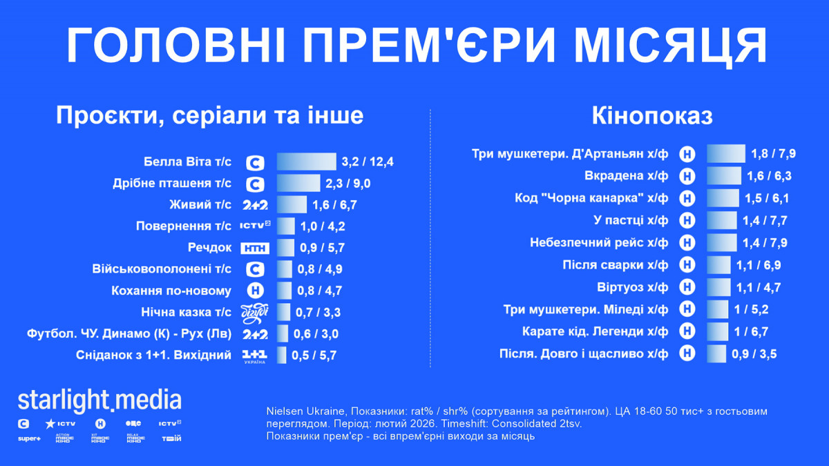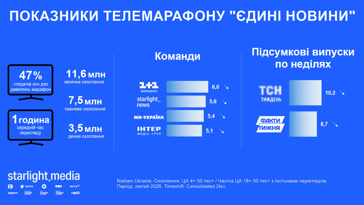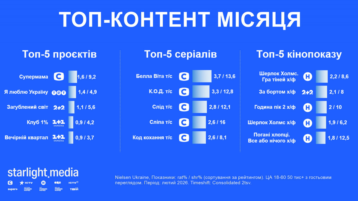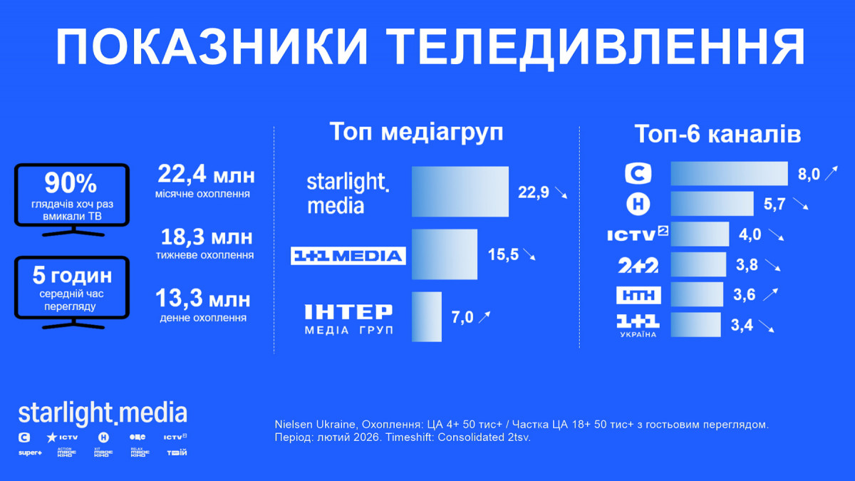 Відімкнення електроенергії внаслідок масштабних повітряних атак продовжують впливати на показники телеперегляду. Водночас у лютому tvr% був на 2% кращий за попередній місяць (11,4% за аудиторією 4+ у міста ыз населенням понад 50 тис. із гостями, що на чверть гірше за лютий 2025-го). Проте телебачення утримує масову аудиторію — 90% телеглядачів хоча б раз вмикали його за минулий місяць і дивилися в середньому 5 годин.
