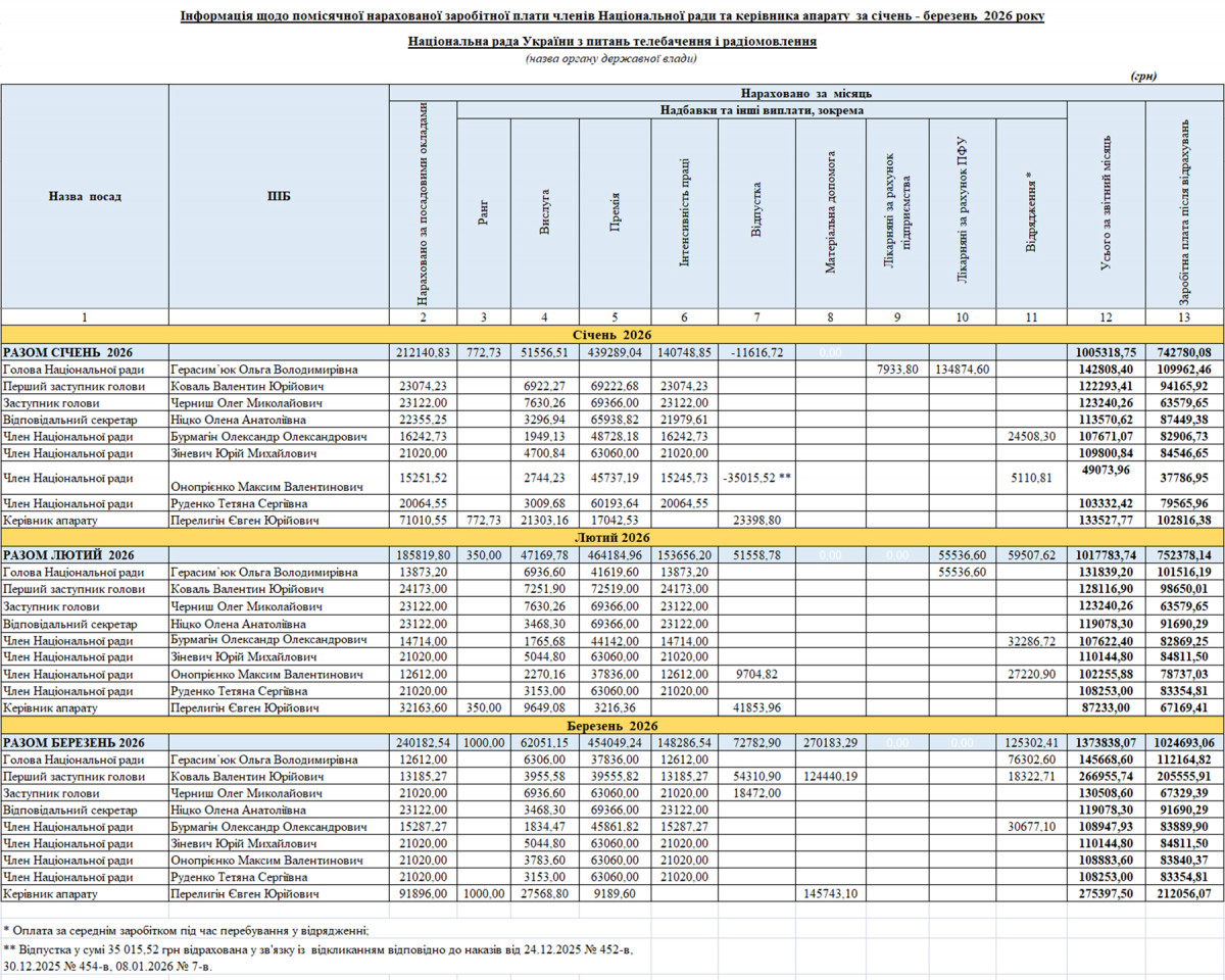 Згідно з даними дашборту Мінфіну за лютий 2026 року середня зарплата керівництва Національної ради з питань телебачення та радіомовлення - 109 тисяч. Приблизно така сама зарплата вказана у декларації голови Нацради Ольги Герасим’юк за 2025 рік. Її заробітна плата - 1 582 041 за рік. Якщо розділити цю суму на 12 місяців та врахувати податки (18% — податок на доходи фізичних осіб + 5% — військовий збір), то виходить 101,5 тисяч гривень. Окрім зарплати голова Нацради отримує пенсію, невелике роялті від видавництва «Старого лева» та відсотки від вкладу в Ощадбанку.