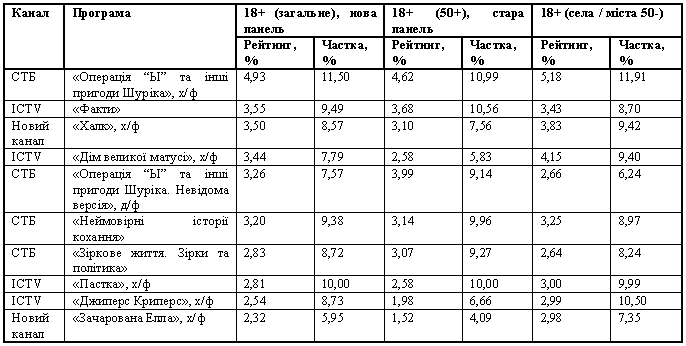 Окрім художніх фільмів, серед найкращих програм минулого тижня – футбольна трансляція «України», «Надзвичайні новини» ICTV та «Документальний детектив» СТБ. Також високі показники мали «Операція “Ы”» (СТБ) та «Анжеліка» («Україна»), яку на початку осені з доволі високими показниками транслював телеканал «1+1».