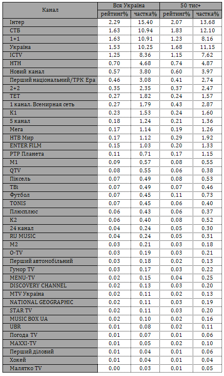 Ранжування каналів у таблиці здійснено за показниками вибірки «Вся Україна».