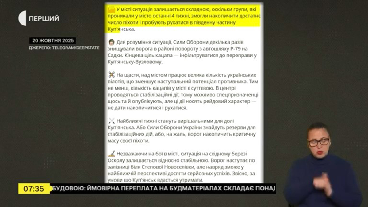 Невідповідно «перекривали» різні БЗ. Ведуча в ранкових випусках 21 жовтня дані Генштабу на 22:00 попередньої доби подавала як дані «протягом минулої доби».