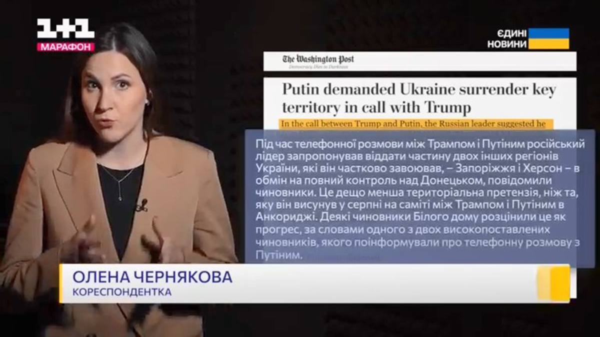 У ранковому ефірі «1+1» цитували Трампа, а власна кореспондентка каналу в США зробила оглядовий сюжет. Тематику обговорювали лише з політичним експертом Максимом Джигуном.