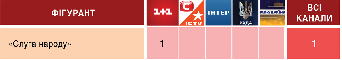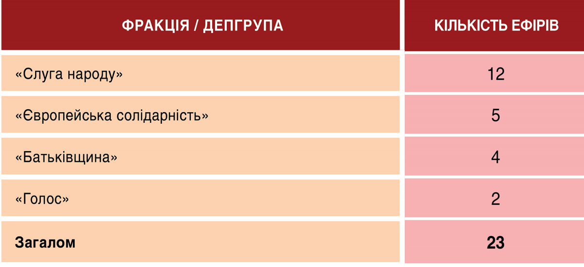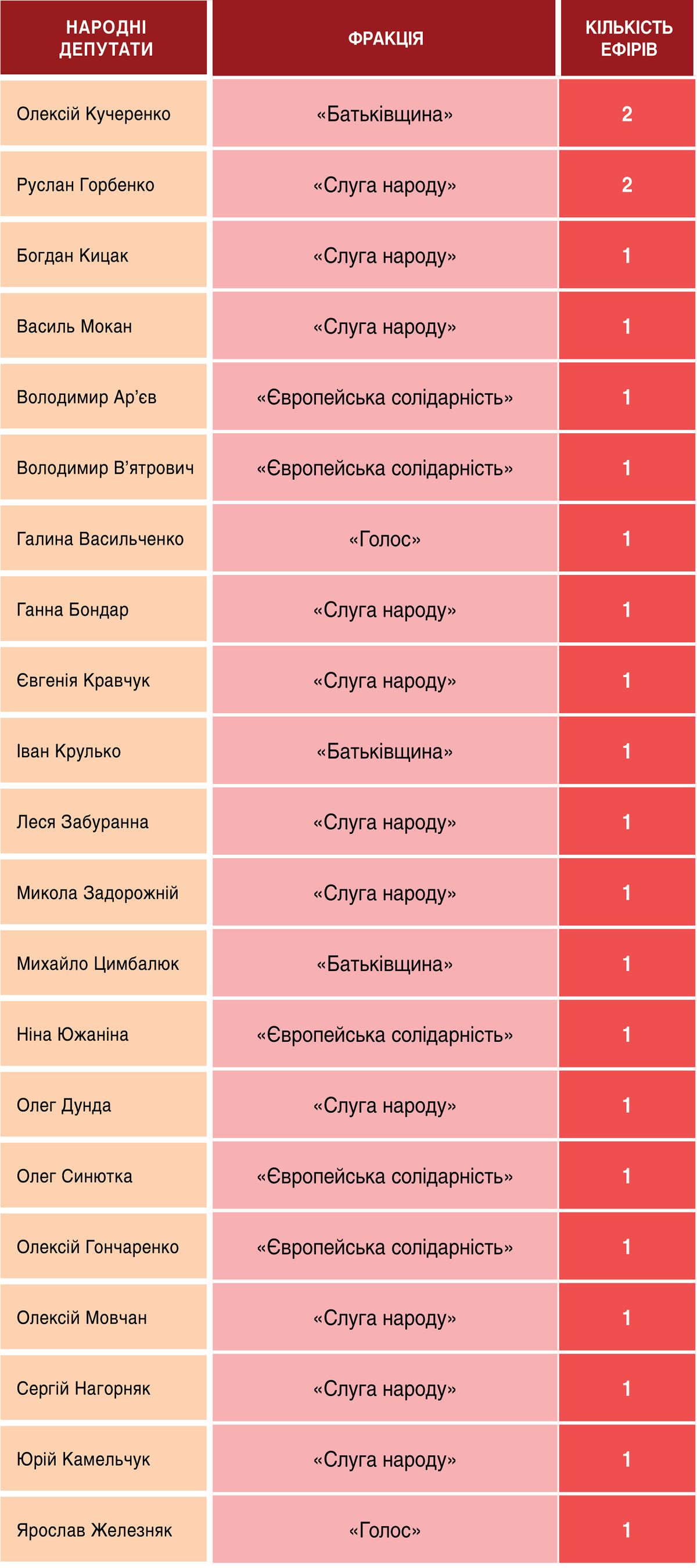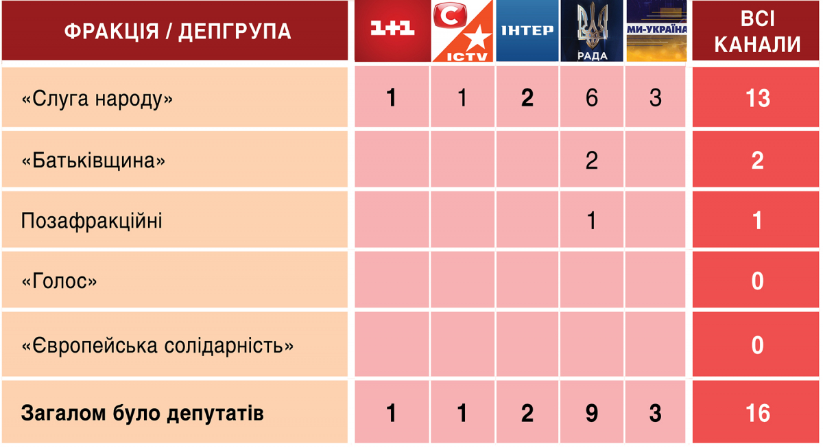 В ефірі каналу двічі побували представник «Батьківщини» Олексій Кучеренко і представник «Слуги народу» Руслан Горбенко, всі інші нардепи були в гостях на каналі по одному разу.