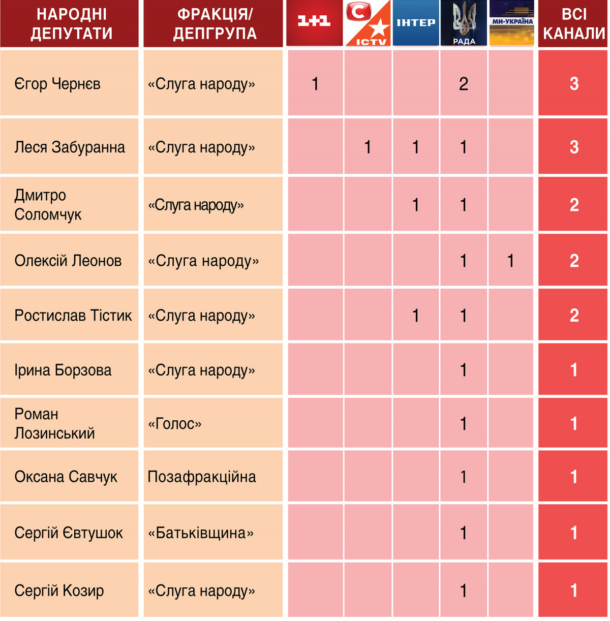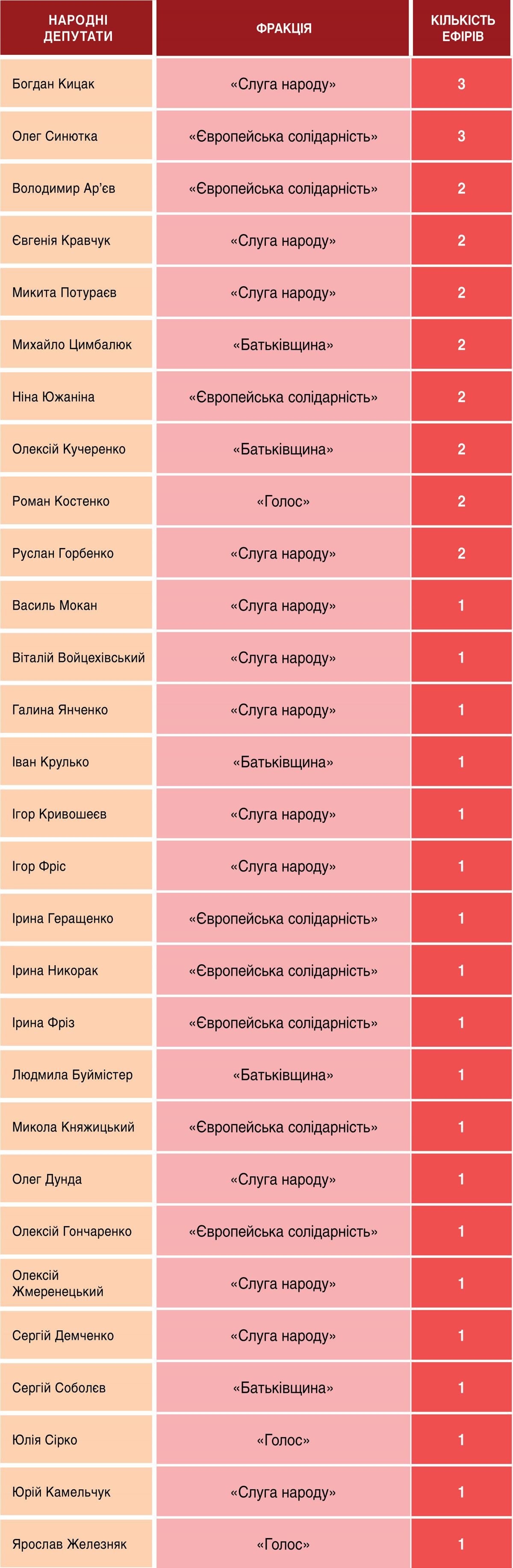 Протягом звітного тижня тричі в ефірі каналу побували нардепи Богдан Кицак від «Слуги народу» і Олег Синютка від «Європейської солідарності», по два рази в ефірі каналу побували нардепи Євгенія Кравчук, Руслан Горбенко і Микита Потураєв зі «Слуги народу», Володимир Ар’єв і Ніна Южаніна з «Європейської солідарності», Олексій Кучеренко і Михайло Цимбалюк з «Батьківщини» і Роман Костенко з «Голосу». Всі інші нардепи гостювали на каналі по одному разу.