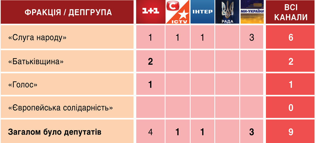 За відсутності в телемарафоні каналу «Рада», протягом звітного тижня народних депутатів у телемарафон знову запрошували мало — лише 9 разів (попереднього тижня було 6 запрошень). В ефірі домінували представники владної фракції партії «Слуга народу», яких запросили 6 разів. Це близько 67% від усіх «депутатських» студій тижня. Втім, цього тижня в ефіри каналу «1+1» двічі запрошували представників фракції «Батьківщини» й одного нардепа з «Голосу». Обговорювали підозру Юлії Тимошенко від НАБУ і САП, представники її фракції активно (і без балансу) просували тезу про політичну заангажованість антикорупційних органів. Канал «1+1» ще й повторив «на біс» запис ефіру з нардепом Власенком з «Батьківщини» наступного дня в ранковому ефірі. Представників фракції «Європейська солідарність» у телемарафон традиційно не запрошували.