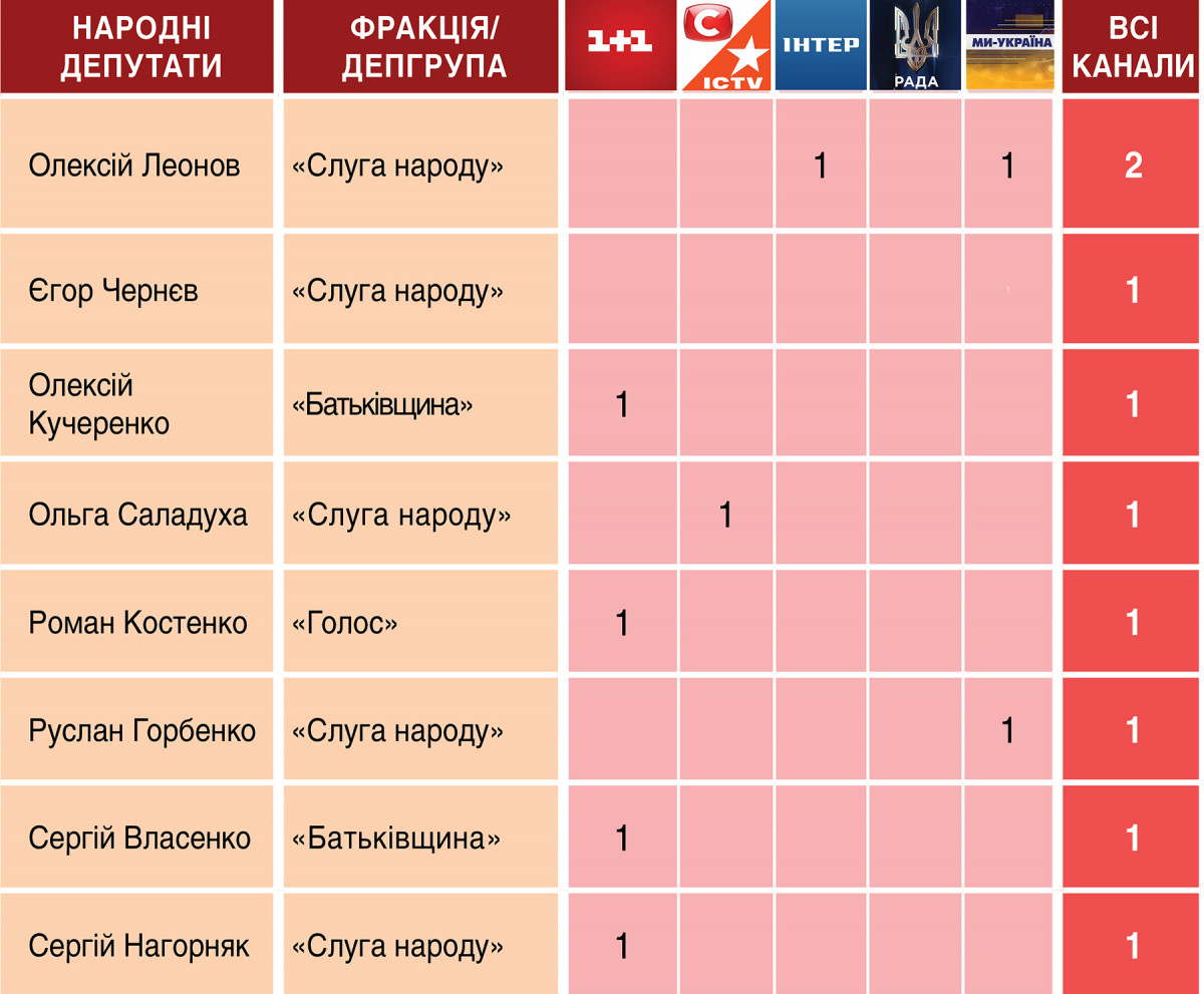 На звітному тижні двічі в ефірі телемарафону на двох каналах побував Олексій Леонов зі «Слуги народу». Усі інші нардепи побували в гостях по одному разу.