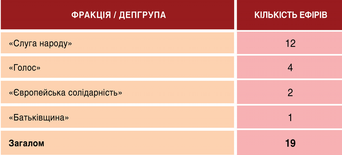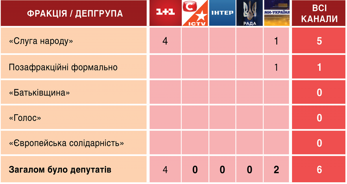 В ефірі Суспільного мовника цього тижня народні обранці були 19 разів (попереднього тижня 34 рази). Народні депутати з владної фракції «Слуги народу» побували в ефірі каналу 12 разів, а представники парламентської опозиції сумарно лише 7 (4 рази гостювали на каналі депутати з «Голосу», 2 рази — з «Європейської солідарності», один раз — із «Батьківщини»). Втім реально представництво владних і опозиційних депутатів було повністю збалансованим у дискусійній тематиці, незначна перевага владної фракції пояснюється тим, що «слуг» частіше кликали говорити на експертні теми за їхньою парламентською спеціалізацією. Відтак, незбалансованих депутатських студій не було. Так само цього тижня не було й випадків невиправданих згадок про фракційну приналежність депутатів в експертній тематиці.