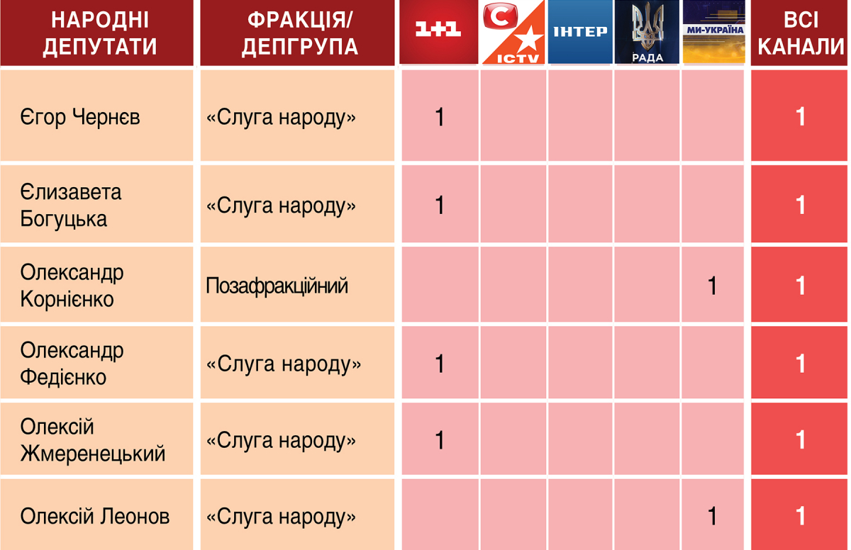 П’ять разів гостем каналу був нардеп зі «Слуги народу» Сергій Нагорняк, щоразу як член Комітету ВР з питань енергетики і ЖКП. По два рази запрошували Марію Іонову з «Європейської солідарності» і Наталію Піпу з «Голосу» (її обидва рази запрошували як секретарку освітнього Комітету ВР). Усі інші нардепи побували в ефірі каналу по одному разу.
