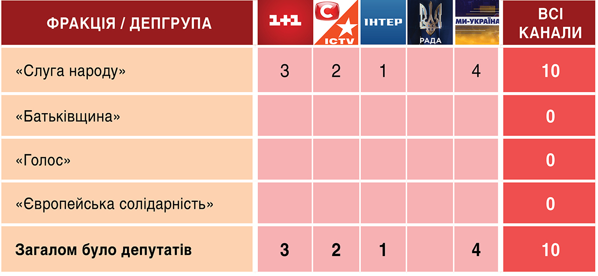 Протягом звітного тижня депутатів у телемарафон запрошували 10 разів (попереднього тижня було 9 гостей-нардепів). І всі вони, без жодного винятку, були представниками владної фракції партії «Слуга народу». Представників опозиційних фракцій «Батьківщини», «Голосу» та «Європейської солідарності» у телемарафон протягом тижня не запрошували взагалі. Тож 100% депутатів у телемарафоні були «слугами народу».