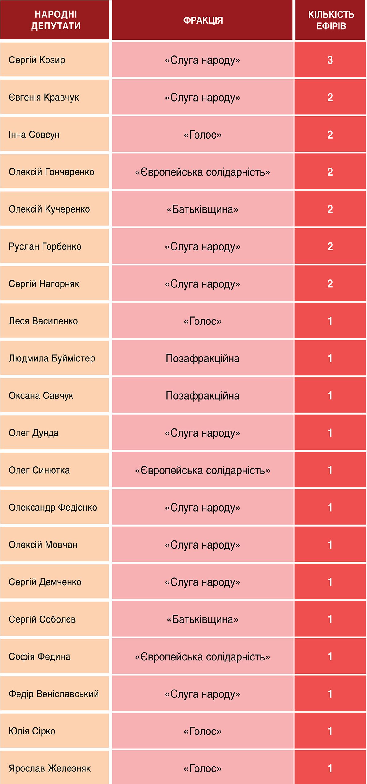 Цього разу найпопулярнішим гостем-нардепом був Сергій Козир зі «Слуги народу», його, як експерта, запрошували й у якості члена енергетичного Комітету Ради, й у якості засновника громадської організації «ВПО України». Ще кілька депутатів із різних фракцій побували в ефірі по два рази.