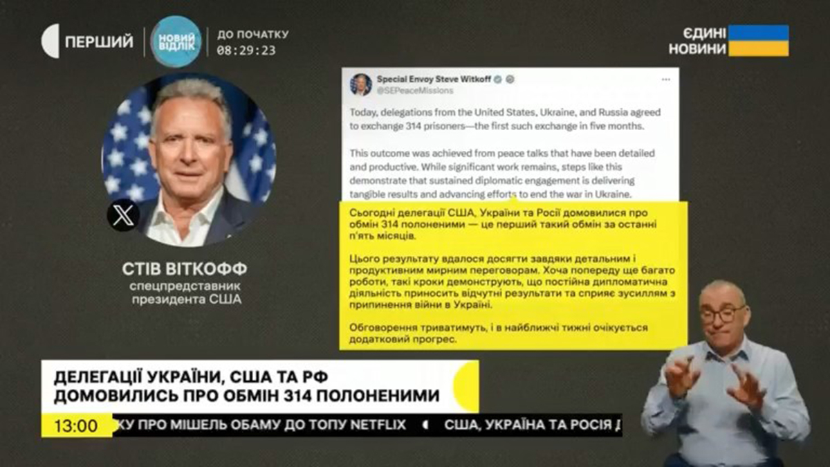 Давали синхрони Зеленського і цитували Умєрова. Цитували Віткоффа. Протягом дня у розмовних студіях каналу обговорювали тематику з засновником медіаплатформи Vilni Media для українців у США Лук’яном Сельським, головою Служби зовнішньої розвідки в 2005—2010 роках Миколою Маломужем (про ймовірні військові питання на переговорах в Абу-Дабі), доктором політичних наук Петром Олещуком, головою Комітету ВР з питань євроінтеграції Іванною Климпуш-Цинцадзе, професором Західноукраїнського нацуніверситету Андрієм Грубінком, експертом програми російських і білоруських студій Ради зовнішньої політики «Українська призма» Артемом Оксентюком, доктором філософії Андрієм Городницьким, керівницею відділу зовнішніх зв’язків Мережі захисту національних інтересів «АНТС» Катериною Мусієнко, директоркою київського офісу GlobSec Юлією Осмоловською, кандидаткою політичних наук Поліною Синовець, політологом Володимиром Фесенком, секретаркою Комітету ВР VII скликання з закордонних справ Лесею Оробець, начальником розвідки спроможності підрозділів Нацгвардії Олександром Мудренком (про те, як події на фронті посилюють переговорну позицію України).
