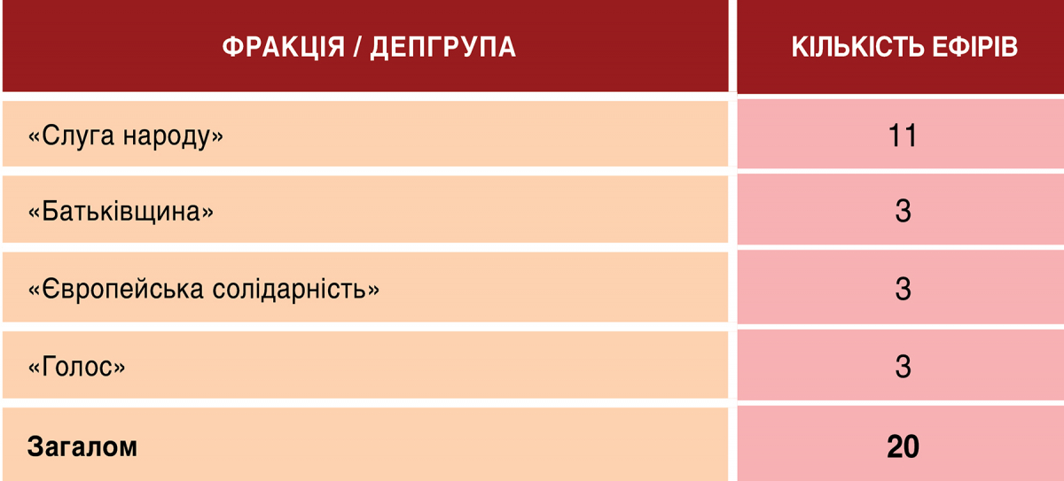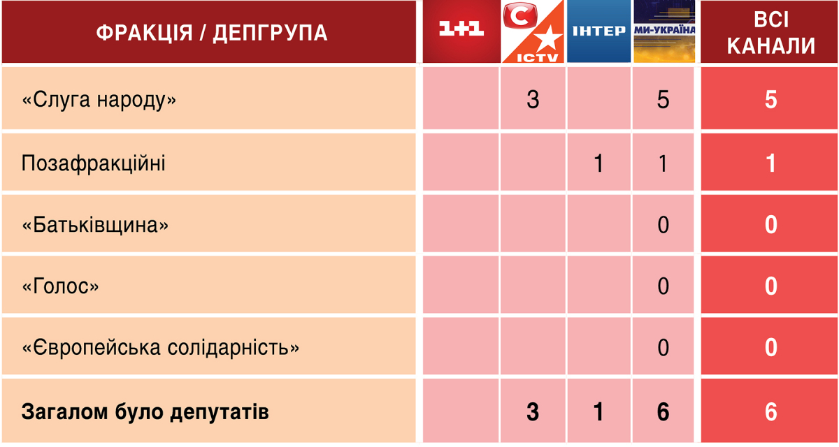 Тричі в ефірі каналу побував Сергій Нагорняк зі «Слуги народу», всі три рази як член Комітету ВР з питань енергетики та ЖКП, ще п’ятеро депутатів побували в ефірі по два рази, теж як члени профільних комітетів. Усі інші були в ефірі каналу по одному разу.