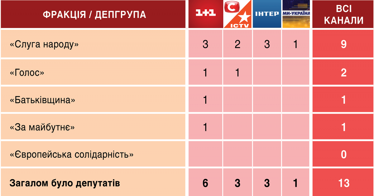Персонально список гостей-депутатів в ефірах Першого каналу Суспільного цього тижня виглядав так: