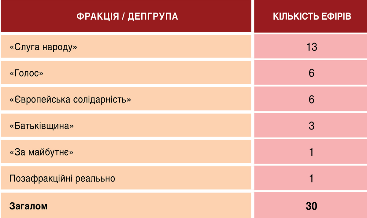 В ефірі Суспільного мовника цього тижня народні обранці побували 30 разів (попереднього тижня теж 30 разів). Народні депутати з владної фракції «Слуга народу» побували в ефірі каналу 13 разів, представники парламентської опозиції сумарно 15 (по 6 разів це були представники «Голосу» і «Європейської солідарності», 3 рази в ефірі були депутати з «Батьківщини»). У більшості дискусійних студій представництво владної і опозиційних фракцій парламенту було збалансованим, але двічі до цього балансу були питання. Так 17 березня в студії були представник «Слуги народу» Ігор Василів і позафракційна депутатка Оксана Савчук. Це вже не вперше, і навряд чи може опонувати цілковито лояльна до влади депутатка. 19 березня Сергію Нагорняку зі «Слуги народу» опонував представник депутатської групи «За майбутнє» Сергій Рудик (теж дивний, як на мене, вибір опонента владі). Цього тижня ведучі гостьових студій тричі невиправдано згадували фракційну приналежність народних депутатів у суто експертних студіях: Ярослава Юрчишина, якого запрошували як голову Комітету ВР з питань свободи слова, Ярослава Железняка, з яким говорили як з першим заступником голови Комітету ВР з питань фінансів, податкової і митної політики, і Галини Васильченко, яку запросили як членкиню цього ж Комітету ВР. Усі три — з фракції «Голос».