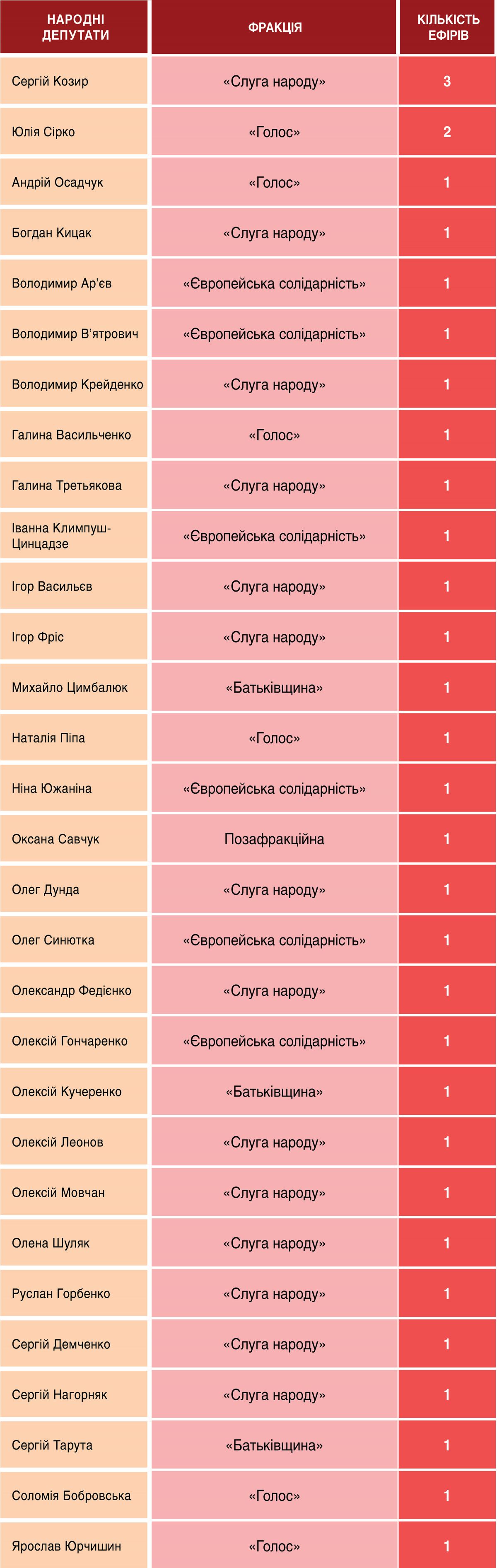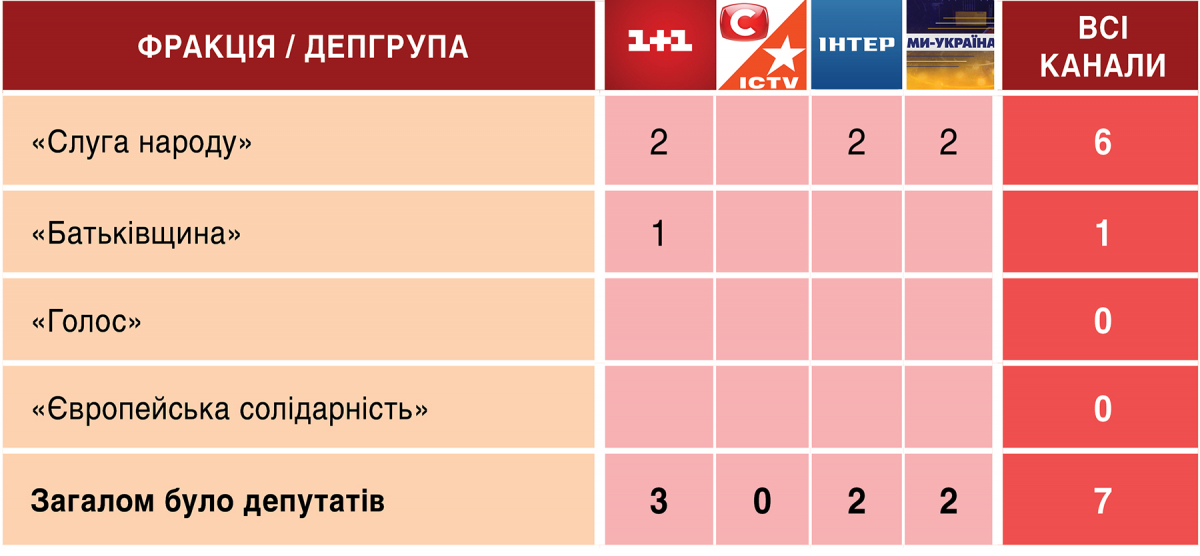 Персонально список гостей-депутатів в ефірах Першого каналу Суспільного цього тижня виглядав так: