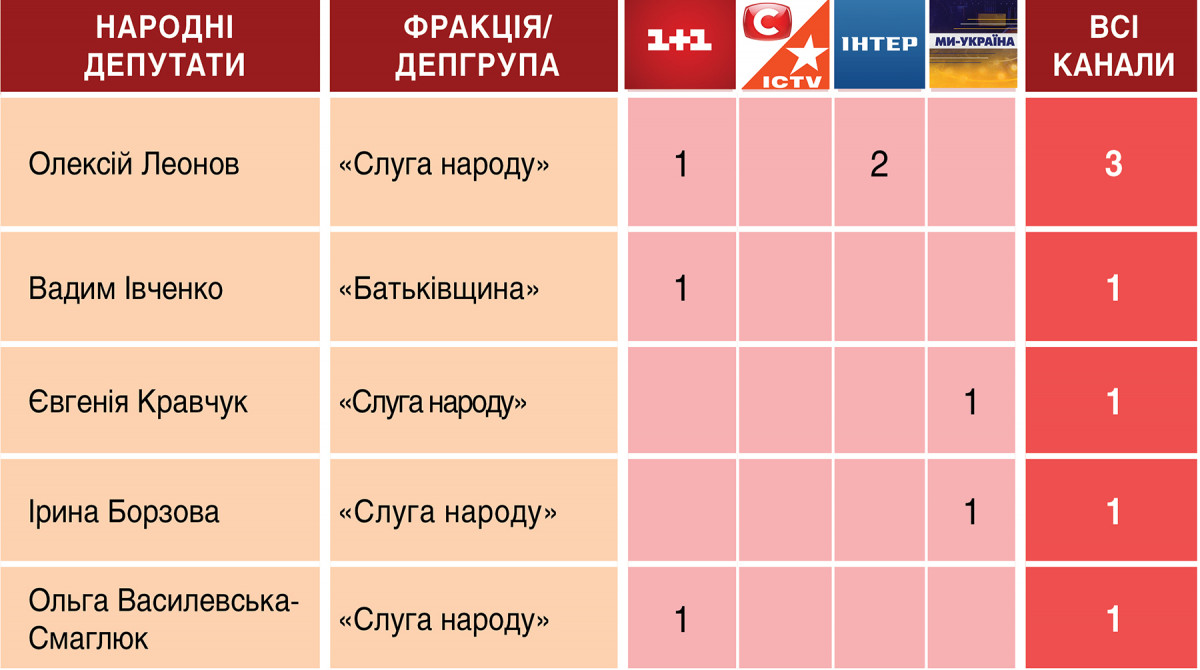 Цей тиждень став «бенефісом» представника «Слуги народу» Олексія Леонова, якого запрошували тричі в ефіри двох різних каналів. До того ж 10 квітня у нічному блоці «Інтера» був повтор «Ньюзмейкера» з Леоновим з попереднього дня. А 11 квітня канал «1+1» також повторив ефір з Леоновим за попередній день.