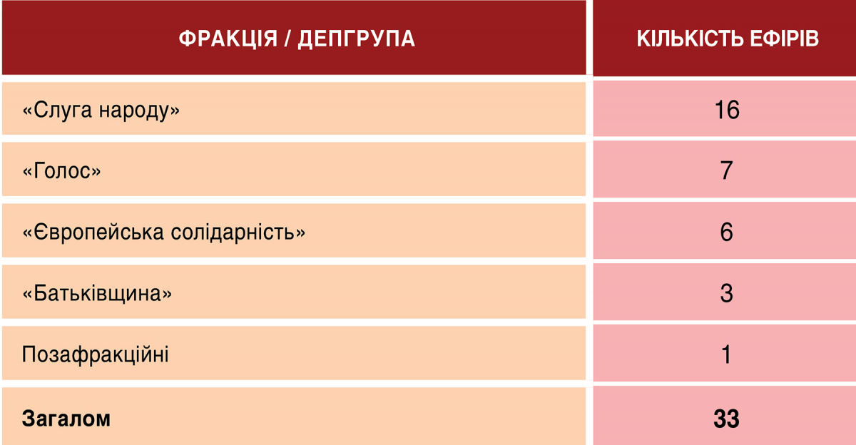 В ефірі Суспільного мовника цього тижня народних обранців запрошували 33 рази (попереднього тижня нардепів запрошували 26 разів). Представників владної фракції «Слуги народу» на канал запрошували 16 разів, представників парламентської опозиції сумарно теж 16 (7 разів це були представники «Голосу», 6 разів — «Європейської солідарності», тричі — представники «Батьківщини»). Ще одного разу запросили позафрракційну Оксану Савчук (дивно, як на мене, навіщо канал її періодично і неконцептуально запрошує). Але зрештою в дискусійних гостьових студіях баланс представників влади і опозиції було повністю дотримано.