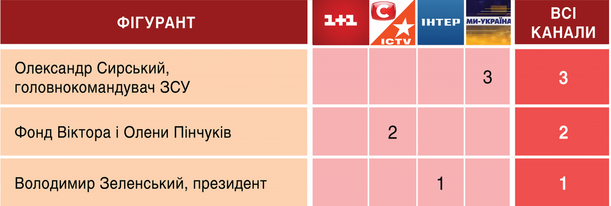 Найбільш активно в ці дні висвітлювали ситуацію на фронті редакції каналів «1+1» і ICTV з СТБ. Найчастіше обговорювали ситуацію на фронті з військовими-фронтовиками (6 разів), 5 разів говорили з речниками різних підрозділів Сил оборони, двічі запросили воєнних експертів. Воєнкори «1+1» зробили в ці дні 2 репортажних сюжети, ще 2 фронтових репортажі і пряме ввімкнення були в ефірі каналів ICTV з СТБ.