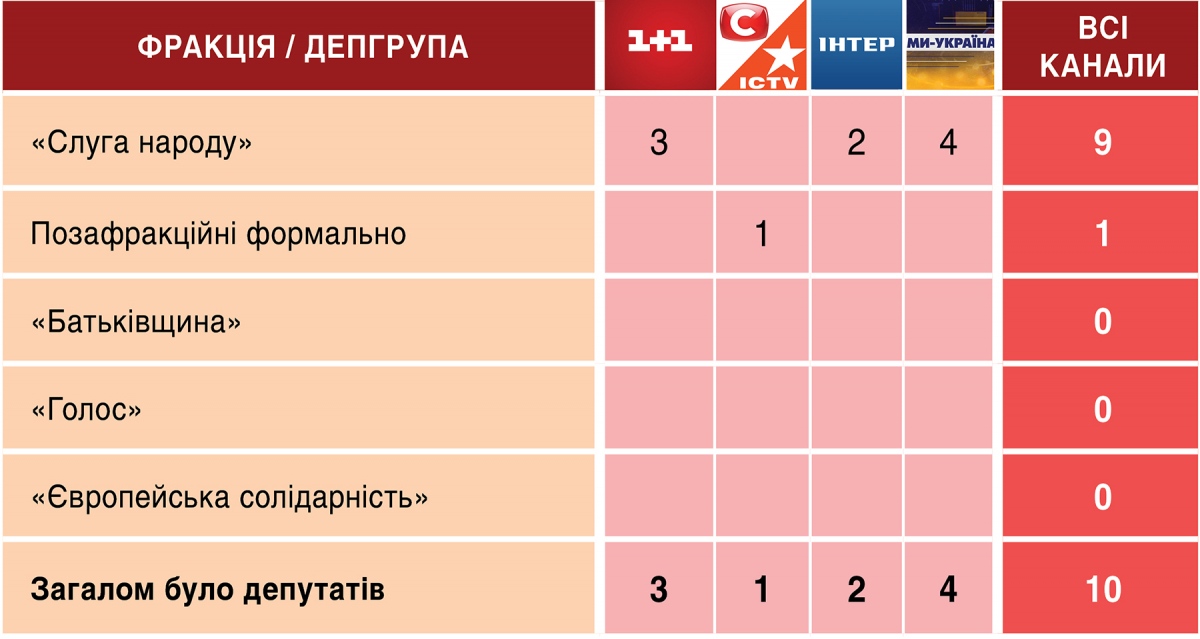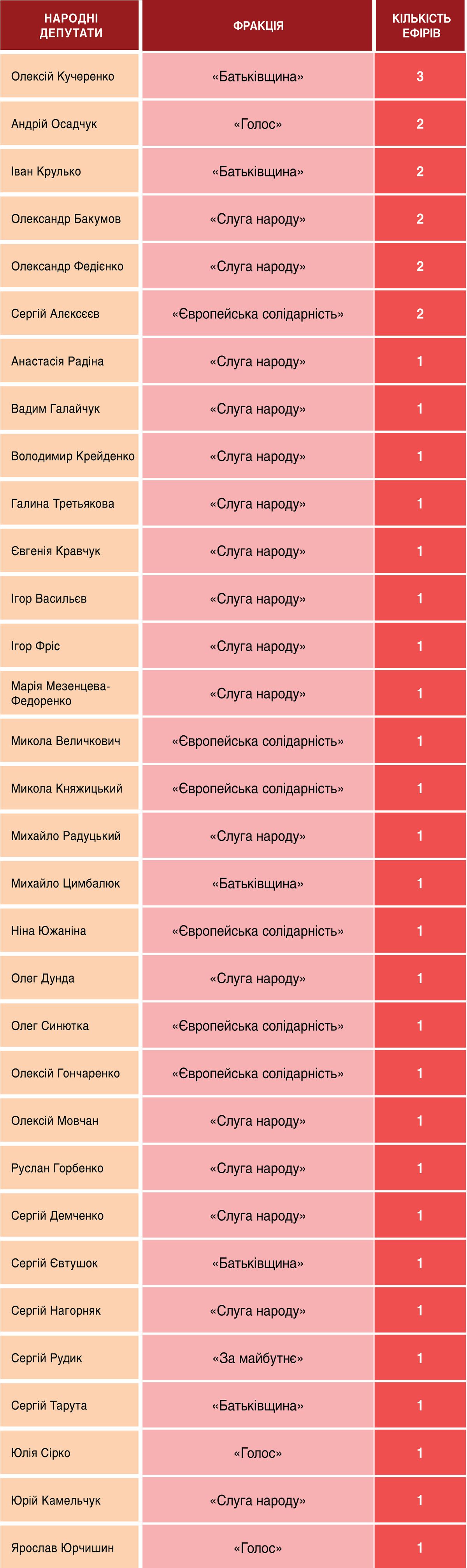 Тричі в ефірі каналу побував Олексій Кучеренко з «Батьківщини», всі три рази в «експертних» студіях як перший заступник голови Комітету ВР з питань енергетики. Ще п’ятеро нардепів — Андрій Осадчук із «Голосу», Іван Крулько з «Батьківщини», Сергій Алєксєєв з «Європейської солідарності», Олександр Бакумов і Олександр Федієнко зі «Слуги народу» — побували в ефірі по два рази.