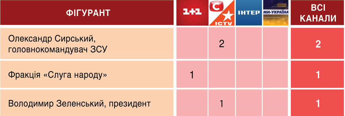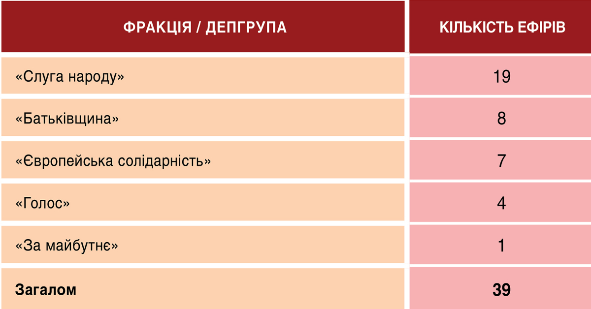 В ефірі Суспільного мовника цього тижня народних обранців запрошували 38 разів (попереднього тижня — 19 разів). Представників владної фракції «Слуги народу» на канал запросили 19 разів, представників парламентської опозиції сумарно 20 (8 разів в ефірі побували представники «Батьківщини», 7 разів — «Європейської солідарності» 4 рази — «Голосу», ще одного разу запрошена представниця «ЄС» не доєдналася до ефіру). Одного разу в ефірі каналу побував представник депутатської групи «За майбутнє». У дискусійних гостьових студіях баланс представників влади й опозиції було повністю дотримано. Натомість протягом тижня на каналі тричі (!) геть невиправдано згадували фракційну приналежність депутатів у «експертних» студіях. Так згадали приналежність до «Голосу» Андрія Осадчука, з яким говорили насправді як із першим заступником голови Комітету ВР із питань правоохоронної діяльності (причому фракцію не називали в представленні й у титрі, але навіщось ведучий згадав її у відводці від розмови). А от приналежність до «Слуги народу» Вадима Галайчука (запрошеного в якості першого заступника голови Комітету ВР з питань інтеграції до ЄС) навіщось згадували й у підводці, й у титрі, й у відводці від розмови. А з нардепом Сергієм Рудиком взагалі-то говорили про проблеми мобілізації як із полковником ЗСУ, й узагалі незрозуміло, навіщо ведучий раптом згадував, що нардеп із групи «За майбутнє».