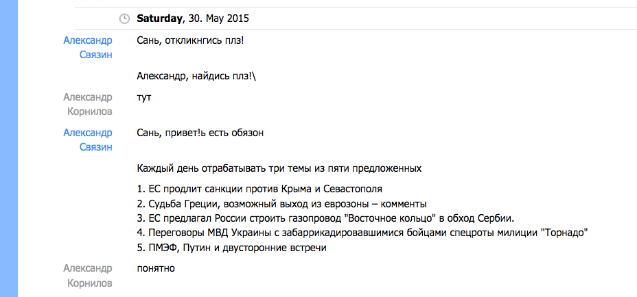 "Є команда опублікувати п’ять репортажів по Європі, зроблених європейською кампанією за наказом Флагмана (тобто, РИА Новости). До публікацій слід включити детальні коментарі експертів", - наказав він Корнілову. - Будь на зв’язку - я надішлю матеріали трохи пізніше".