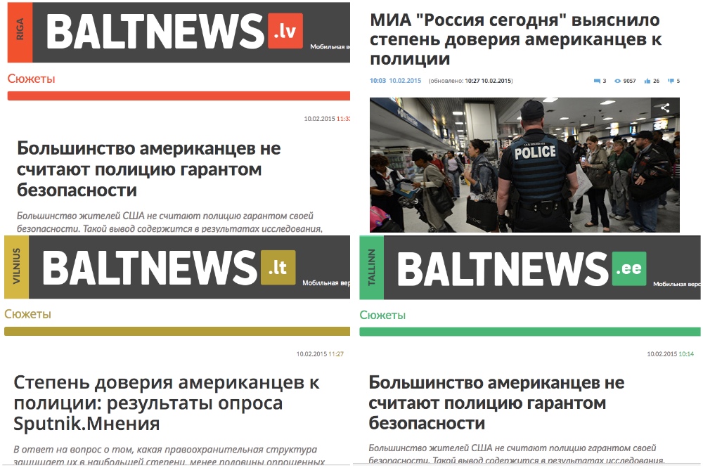 Цього разу він навіть не потурбувався повідомити, щоб Корнілов написав власну версію статті для естонських Baltnews. "Більшість американців не вважають поліцію гарантом своєї безпеки", - стверджує заголовок матеріалу на Baltnews Estonia. Подібні публікації того ж дня вийшли на латвійських та литовських версіях Baltnews.