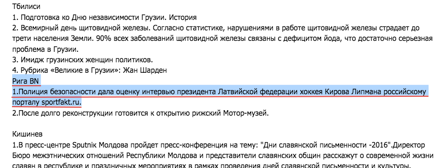 25 травня 2016 року Связін – імовірно помилково – надіслав Корнілову перелік тем, які висвітлювалися у ЗМІ, що належать Кремлю по всій території колишнього СРСР: у країнах Балтії, Киргизстані, Білорусі, Грузії, Молдові, Узбекистані, Казахстані, Азербайджані, та Осетії сепаратистському утворенні в Грузії. Естонія мала два окремих місця в списку – одне по Baltnews, інше по місцевій редакції Sputnik.