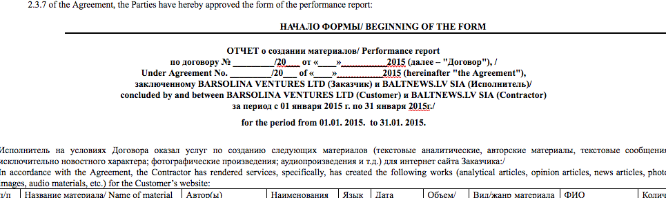 На початку 2015 Altmedia почала відправляти щомісячні звіти про трафік, включно з заголовками найбільш відвідуваних статей, до Barsolina Ventures. Ці звіти без підпису посилаються на новий контракт від 1 січня 2015 року. За ним Barsolina Ventures щомісяця сплачувала Altmedia 11400 євро.