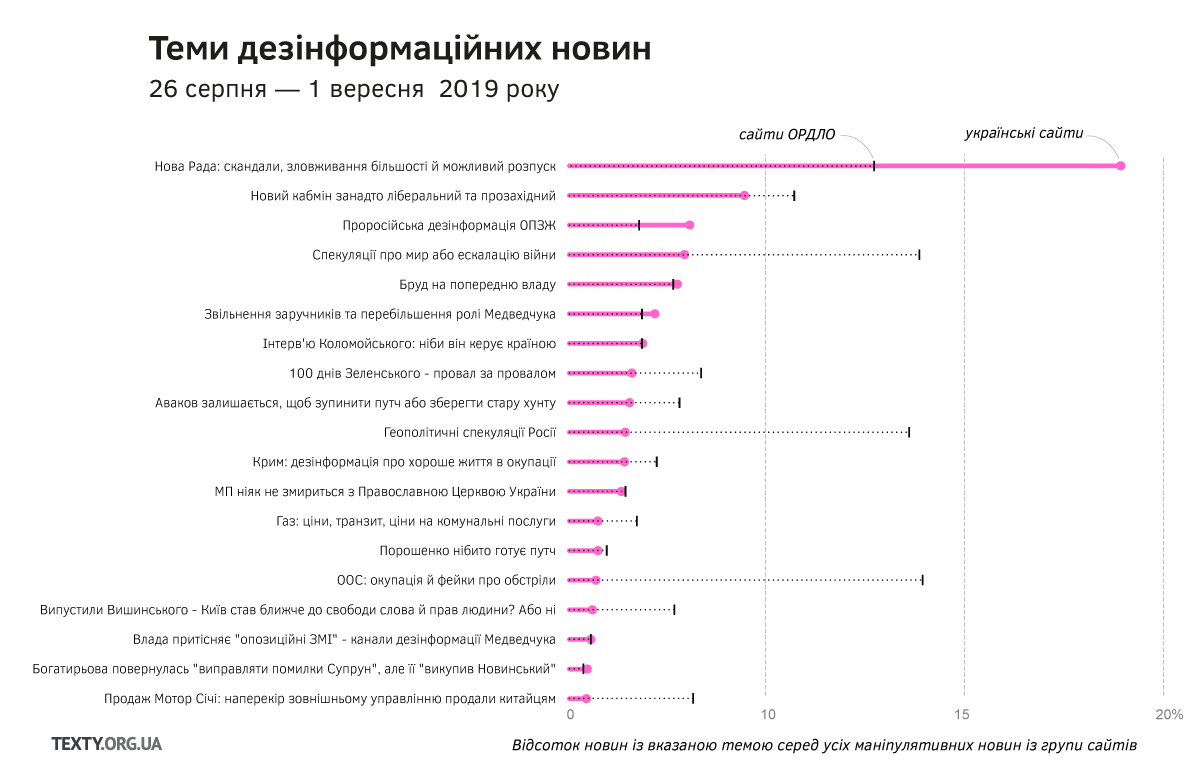Окрім повідомлень про курйози та сфотографовані месенджери депутатів, у дезінформації й маніпулятивних новинах писали про розподіл комітетів, права опозиції та перспективи розпуску Ради, яка щойно почала роботу. Новини про можливий розпуск ВР були зумовлені інтерв’ю Коломойського, який вказав на “розрізненість” однопартійної більшості. Видання з окупованих територій підхопили цей коментар, і разом з ідеєю про жорстку ієрархію всередині фракції просували тезу про несамостійність Ради та її залежність від президента. Медіа, близькі до ОПЗЖ, скаржилися на те, що опозиції виділили мало комітетів, а роботу Комітету з питань свободи слова блокуватиме фракція “Слуга Народу”.