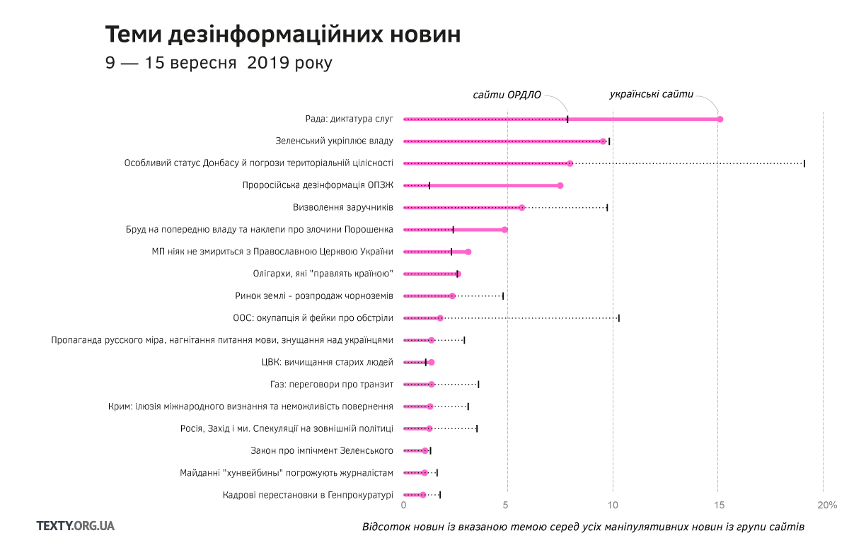 Українські маніпулятивні матеріали придумали і розвивають ідею про громадянську інформаційну війну в Україні (“патріоти проти патріотів”, маючи на увазі протистояння Зеленського і Порошенка). А дезінформатори ОРДЛО просувають дві взаємовиключні тези – “Зеленський продовжує репресії Порошенка” та “Зеленський протидіє Порошенку” (який, якщо вірити виданням окупованих територій, увійшов до “союзу олігархів”, об’єднавши зусилля з Рінатом Ахметовим).