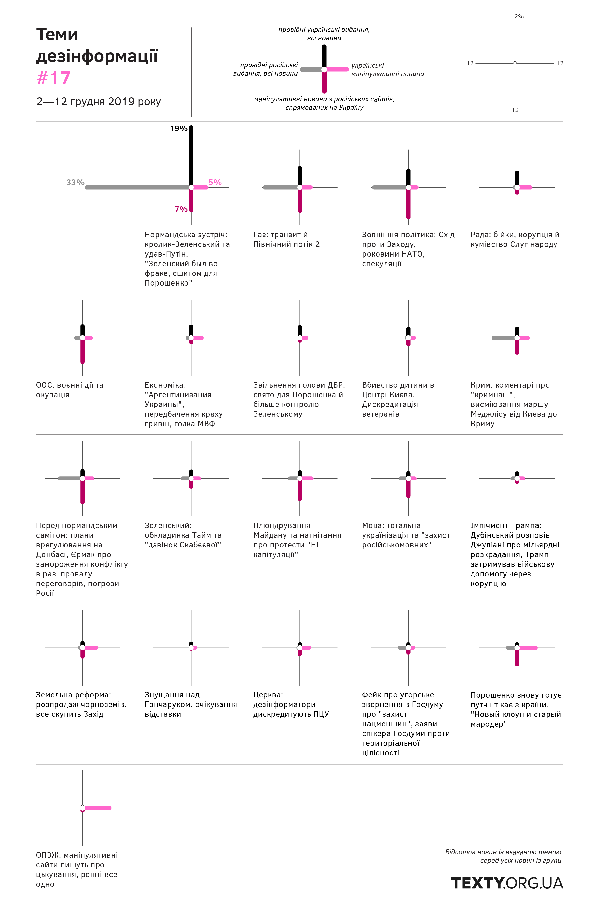 Найбільша новина тижня — зустріч лідерів України, Росії, Франції і Німеччини у Парижі. Перед самітом у медіа панувала збуджена атмосфера. Російські дезінформаційні видання, що націлені на Україну, й українські сайти-клікбейти активно обговорювали ствоення “Стіни” на Донбасі, тобто, заморожування конфлікту. Такий варіант розвитку подій вони всіляко критикували і посилися на коментар російського політика: “Строить стену — это замораживать конфликт на многие годы. Причем я не уверен, что [это] будет в пользу Киева. Потому что Донбасс все-таки очень крупный промышленный регион… И вряд ли он будет жить в состоянии некоей изоляции”. Мейнстрімні українські медіа найбільше обговорювали сценарії реінтеграції Донбасу та наслідки війни.