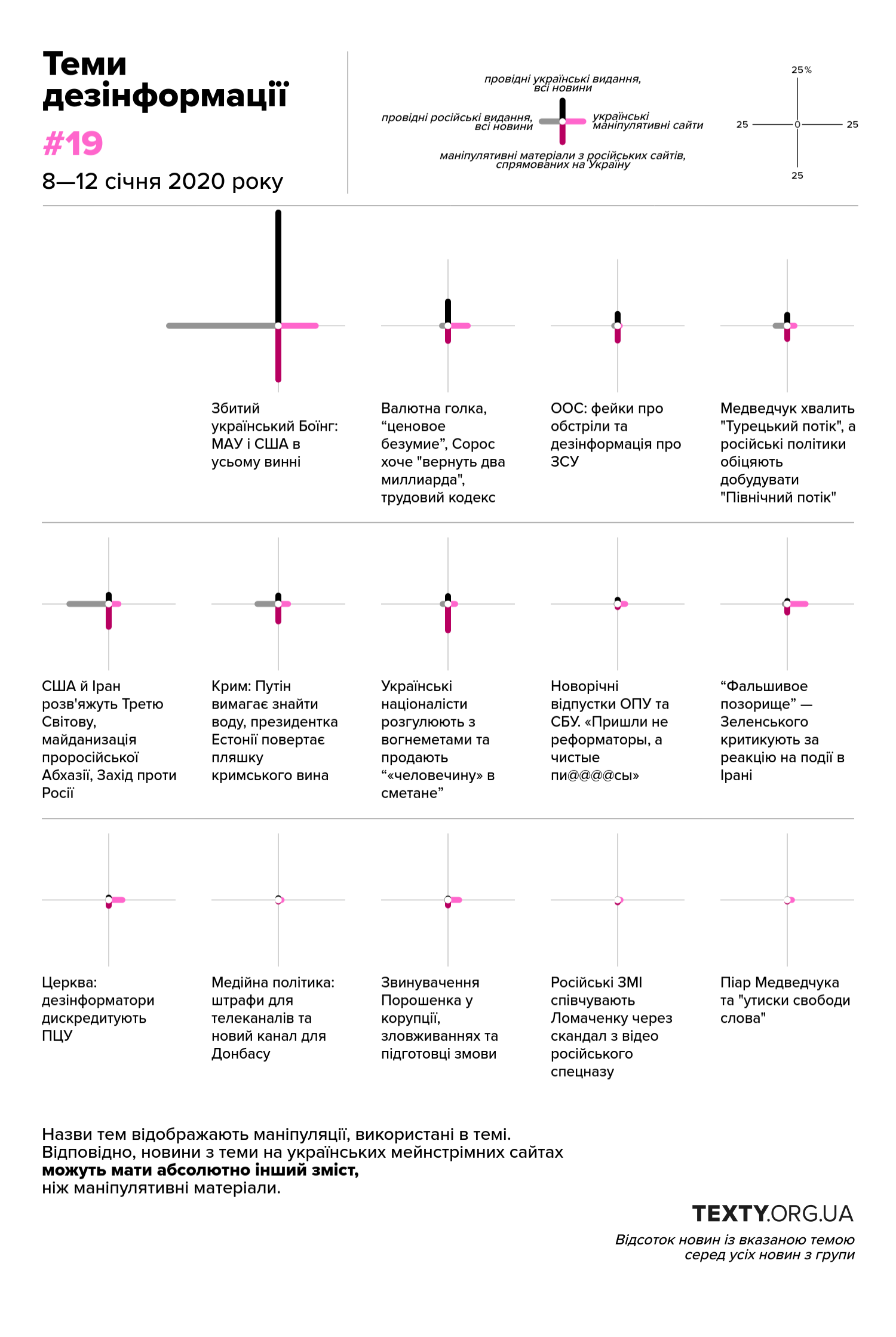 Найбільшим інфоприводом стало збиття іранцями літака МАУ над Тегераном. Емоційність текстів українські маніпулятивні сайти посилювали коментарями “незалежних авіаекспертів”. В них Зеленський, як завжди, “сошел с ума”, “сеть в гневе”, а порівняння цієї трагедії зі збитим МН-17 підводить до висновків: “в двух случаях странным образом присутствует украинский фактор. В первом случае борт был сбит над территорией Украины. Во втором уже сам самолет принадлежит нашей стране”. Плюс (зненацька!) виробник обох літаків – США, а на борту не було жодного американця.