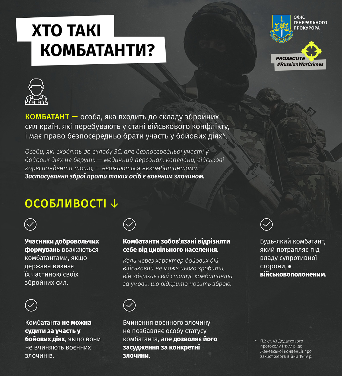 Але це все стосувалося цивільних. Третя Женевська конвенція захищає комбатантів. Комбатантом може бути представник тероборони або поліції: за великим рахунком це будь-хто, хто відкрито носить зброю, має знаки розрізнення, має командування і вступає у відкрите зіткнення із супротивником. От ми з вами зараз раптом бачимо москалів, ми вдягнули щось подібне на форму, обмотали руки жовтими стрічками, щоб випадково не вбити одне одного, та зі зброєю вступили у бій — і ми автоматично стаємо комбатантами і вже маємо гарантії захисту. Але й тут є нюанси.