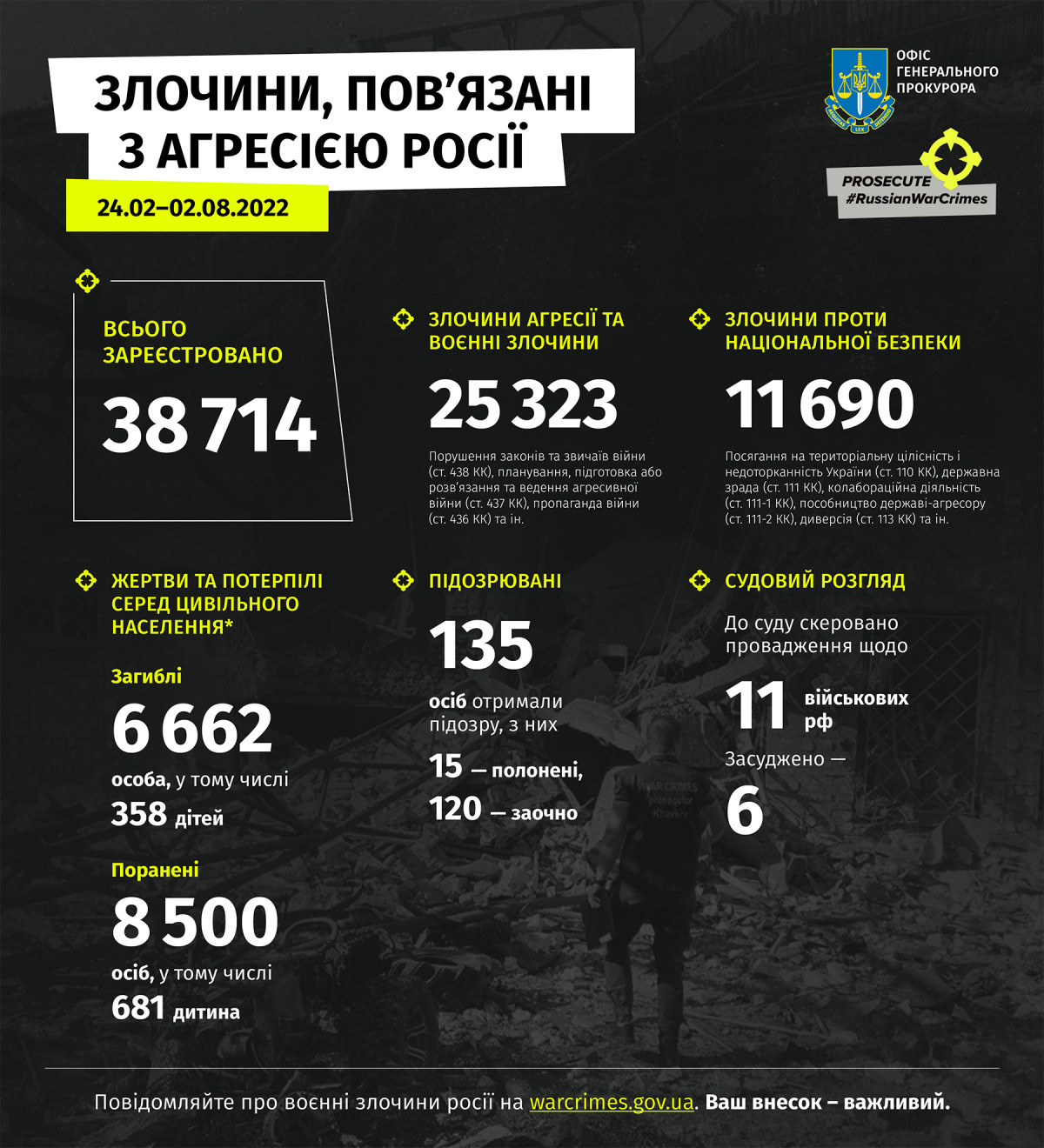 За даними Офісу Генерального прокурора, з початку повномасштабного вторгнення Росії 24 лютого 2022 року і до 2 серпня правоохоронні органи зареєстрували понад 38 714 кримінальних проваджень щодо злочинів, пов’язаних із російською агресією, з них понад 25 323 — щодо воєнних злочинів. Воєнні злочини призвели до загибелі 6662 цивільних українців, більше 8500 поранено — це лише офіційно зареєстровані факти. Найімовірніше, цифри будуть більшими. В Україні тисячі пошкоджених та зруйнованих об’єктів — будинків, шкіл, лікарень тощо. Підозру у вчиненні воєнних злочинів уже отримали 135 людей, із них 15 — полонені, решта — заочно. До суду дійшли справи щодо 13 російських військових, засуджено шістьох.